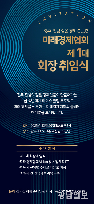 박진환 미래경제협회 준비위원장은 “미래경제협회는 단순한 사교 모임을 탈피해 지역경제의 담론을 주도하고 실질적 변화를 끌어내는 뉴오피니언 리더 그룹이자 행동하는 경제 플랫폼이 될 것”이라며 “젊은 리더들의 신선한 혁신과 강한 추진력을 동력 삼아 광주·전남을 넘어 호남 전체를 아우르는 초광역 경제 협력의 핵심 앵커 조직으로 도약하겠다”고 말했다.