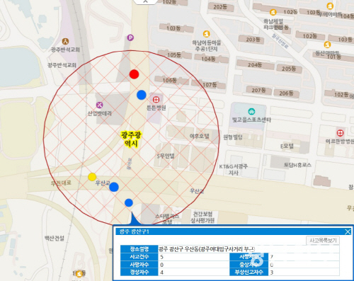 북구의 경우 매곡동 행정복지센터 부근(사고 3건·부상 6명), 운암동 운암사거리·임동오거리·신안동 역전지구대 부근(사고 3건·부상 4명), 용봉동 좋은약국 부근 △우산동 말바우사거리(사고 3건·부상 3명) 등이 위험 지역으로 분류됐다.