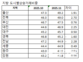 실제 울산(47.3%→49.2%), 전북(46.3%→49.0%), 부산(46.7%→47.5%) 등 일부 광역시는 산업 경기 개선 기대와 공급 부담 완화에 힘입어 비교적 견조한 흐름을 보였다.