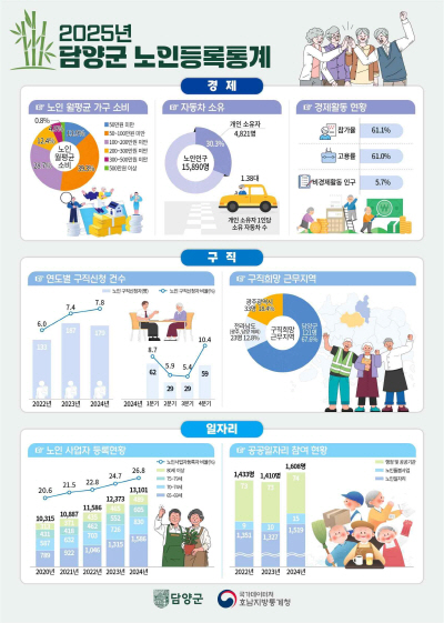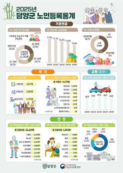한편 이번 통계는 담양군 노인을 대상으로 인구·가구, 경제, 일자리, 복지, 건강 등 5개 부문 60개 지표를 선정해 담양군 노인 실태를 진단해 보다 나은 노인 복지정책을 수립하기 위해 마련됐다.