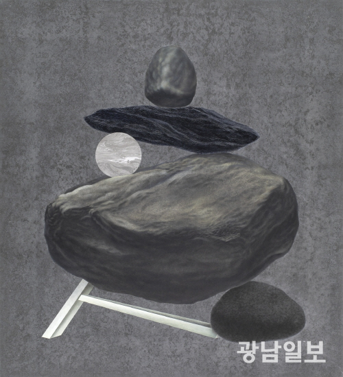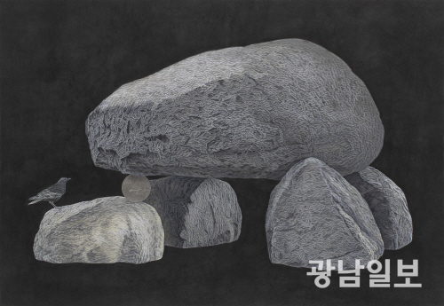 작가의 최근 작업은 ‘돌’이라는 존재에 집중돼 있다. 작가에게 돌은 인간과 시간을 넘어, 건강과 안녕을 기원하는 보편적 상징이자 믿음의 대상이다. 산과 마을의 성황당에 쌓인 돌탑, 절벽에 새겨진 마애불, 불상을 새기는 불교적 행위 등은 시대와 종교를 넘어 인간이 마음속 염원을 표현하는 방식으로 읽힌다. 작가는 산을 거닐며 방문객들이 서로 말하지 않아도 하나 둘씩 돌탑을 쌓는 모습을 관찰하면서, 돌과 인간의 관계에 대한 경외심을 갖게 됐다는 설명이다.