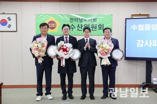 | 수협중앙회는 9일 전남도의회를 방문해 농수산위원회 소속 신승철 의원(더불어민주당·영암1), 진호건 의원(더불어민주당·곡성), 정길수 의원(더불어민주당·무안1) 등 세 의원에게 감사패를 전달했다. |