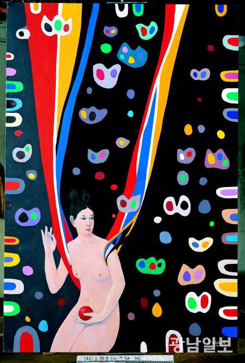 이 시기 오 화백은 노트에 ‘해와 바람, 흙과 물, 나무와 풀, 그리고 우리 자신이 하나가 되는 것이 곧 선(禪)’이라고 기록하며, 예술을 통해 자연과 인간의 본래 순수성을 회복하고자 했다. 작품에 등장하는 ‘여인’은 이러한 순수의식과 자연 본질을 상징하는 존재로, 생명과 조화의 메시지를 담고 있다.