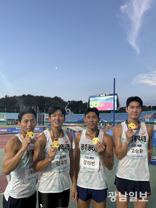| 지난 9월 ‘제36회 KTFL 전국실업단대항육상경기대회’ 남자 400m 계주에서 금메달을 따낸 광주시청 육상팀. 왼쪽부터 김태효, 김국영, 강의빈, 고승환. 사진제공=광주시청 육상팀. |