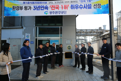 | 광주환경공단은 지난 12일 광산구 제1음식물자원화시설에서 최우수시설 현판식을 가졌다. |