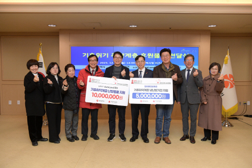광주시는 15일 시청 비즈니스룸에서 기아오토랜드 광주, 삼성전자, 사회복지공동모금회 광주지회와 함께 기후위기 취약계층 지원을 위한 기부물품 전달식을 가졌다.