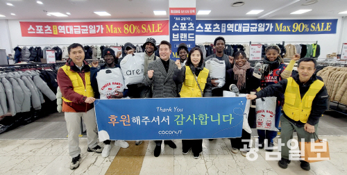 17일 사단법인 코코넛에 따르면 박기성 거성시너즈 회장이 롯데아울렛 풍암점 1층 스포츠 매장에서 아프리카 유학생 13명과 함께 겨울옷을 골라 입을 수 있도록 했다.