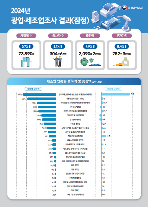 지난해 광업·제조업 전체 출하액은 2090조2000억원으로 전년보다 97조7000억원(4.9%) 늘었다. 부가가치는 752조3000억원으로 77조2000억원(11.4%) 증가했다.