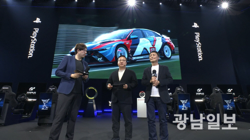 현대차가 지난 21일 일본 후쿠오카 국제 회의장에서 열린 ‘그란 투리스모 2025 월드 시리즈’ 최종전에서 현대자동차 박준우 N매니지먼트실장(상무)과 폴리포니 디지털 야마우치 카즈노리 대표가 아반떼 N TCR을 ‘그란 투리스모 7’에 투입한다고 발표했다.