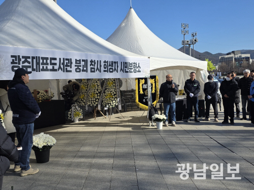 | 민주노총 전국건설노동조합 광주전남건설지부는 22일 광주 동구 5·18민주광장에 ‘광주대표도서관 붕괴사고 희생자 시민합동분향소’를 차렸다. |