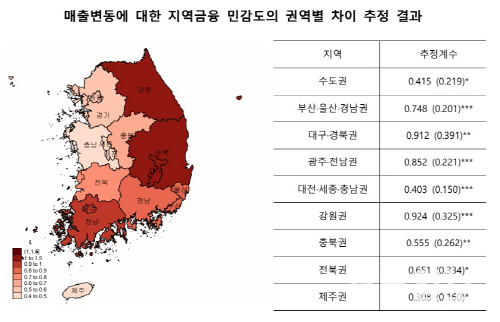 이 같은 현상은 비수도권 지역에서 더욱 두드러졌다. 권역별로 보면 광주·전남권과 대구·경북권의 대출 민감도가 타 지역에 비해 상대적으로 높은 것으로 추정됐다. 연구진은 해당 지역 금융기관의 규모가 영세하고, 제조업 비중이 높은 산업 구조가 영향을 미친 것으로 분석했다.