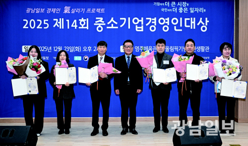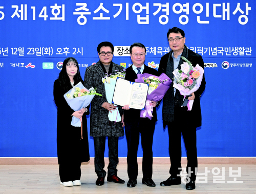 | 23일 오후 광주 서구 풍암동 염주체육관 내 올림픽기념국민생활관에서 열린 ‘2025 제14회 중소기업 경영인 대상’ 시상식에서 종합대상 중소벤처기업부 장관상을 수상한 허승업 ㈜삼우산업대표(왼쪽 네번째)와 직원들이 기념촬영을 하고 있다. |
