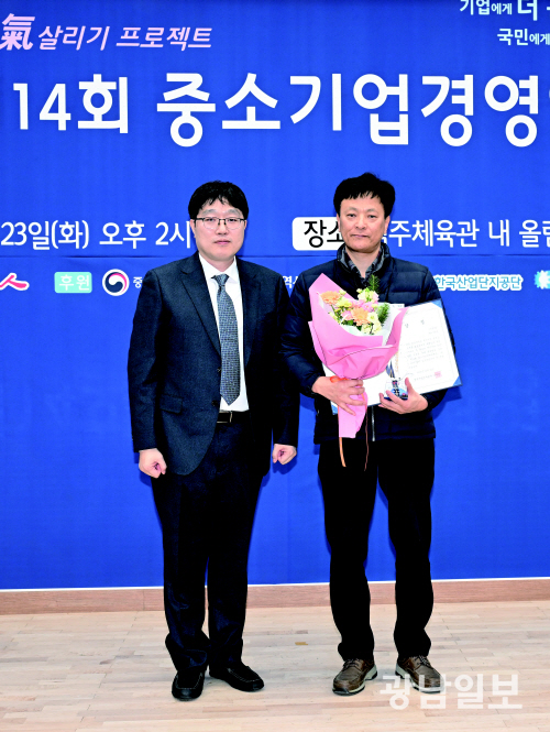 | 한국산업단지공단 이사장상(대상)을 대리 시상한 윤일 한국산업단지공단 광주지역본부 혁신기획팀장(왼쪽)과 배희섭 ㈜우성정공 이사 |