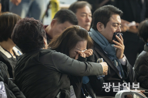 | 눈물 흘리는 유가족들 29일 오전 전남 무안국제공항 여객터미널에서 열린 12·29 여객기 참사 1주기 추모식에서 유가족들이유가족들이 슬픔을 참지 못하고 흐느끼고 있다.사진공동취재단 |