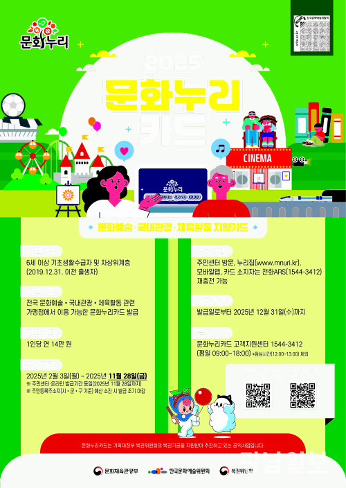 통합문화이용권(문화누리카드)은 취약계층의 삶의 질 향상과 문화 격차 완화를 위해 국내 문화예술·여행·체육활동을 지원하는 사업으로 6세 이상의 기초생활수급자와 차상위계층을 대상으로 하며, 전국 3만4000여개 가맹점에서 폭넓게 사용할 수 있다.