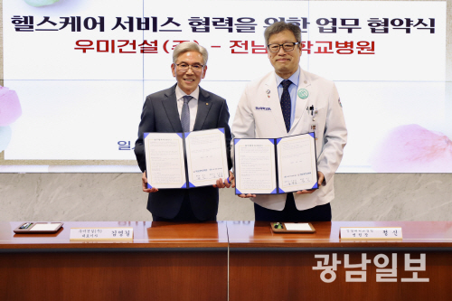 | 우미건설과 전남대병원은 지난 29일 전남대병원에서 우미건설 김영길 사장(왼쪽), 전남대병원 정신 병원장이 참석한 가운데 업무협약을 체결했다. |