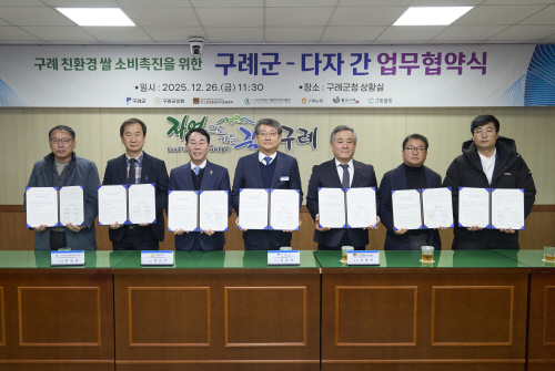 | 구례군은 친환경 농업의 가치를 확산하고 쌀 소비 기반을 강화하기 위해 최근 공공·금융·농협·민간이 참여하는 다자간 업무협약을 체결했다. |