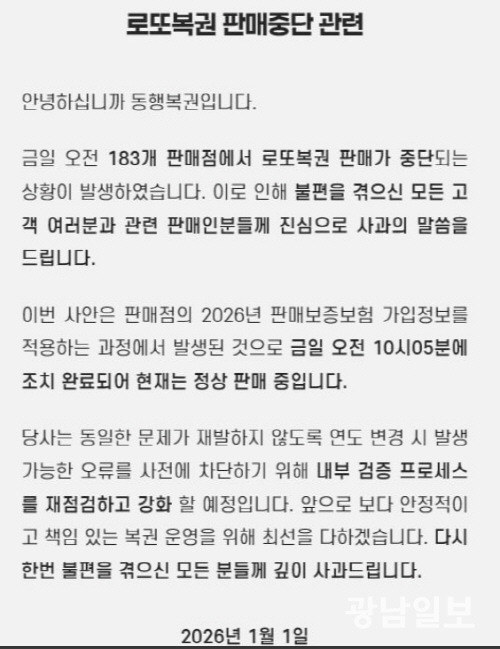 50대 업주 B씨는 “해마다 새해 첫 날에는 손님들이 많이 몰려 평소보다 이른 아침부터 판매점 운영을 나서는데 올해는 손님들을 그냥 돌려보내야 했다”면서 “동행복권 측의 사전 안내나 공식적인 사과도 없었다”고 말했다.