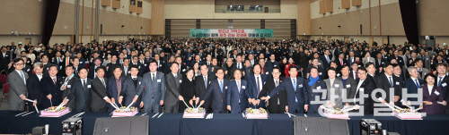 2일 오전 광주 서구 치평동 김대중컨벤션센터 다목적홀에서 열린 ‘2026년 광주·전남 노사민정 합동 신년인사회’에 참석한 양진석 광주경영자총협회장과 강기정 광주시장, 지역 국회의원, 기업인, 노동계 등 정·관계 인사들이 떡 케이크를 자르고 있다. 최기남 기자 bluesky@gwangnam.co.kr