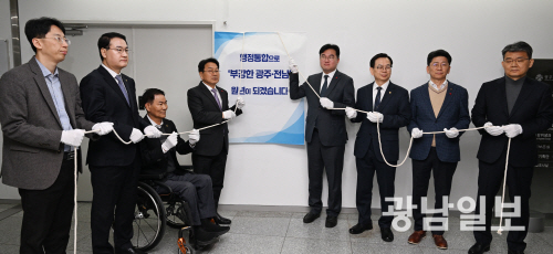 | ‘광주·전남 행정통합 추진기획단 현판 제막식’ 5일 오전 광주시청 추진기획단 사무실 앞에서 열린 ‘광주·전남 행정통합 추진기획단 현판 제막식’에 참석한 강기정 광주시장과 정준호 국회의원등이 기념촬영을 하고 있다.최기남 기자 bluesky@gwangnam.co.kr |