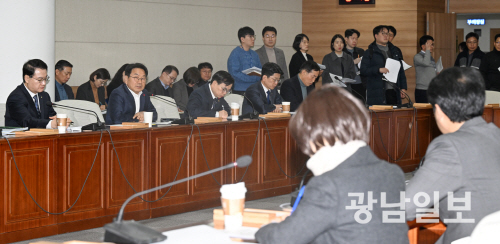 | 광주·전남 행정통합 시의원 간담회 6일 오전 광주시의회 대회의실에서 열린 광주·전남 행정통합 시의원 간담회에서 강기정 광주시장이 추진상황에 대해 설명을 하고 있다. 최기남 기자 bluesky@gwangnam.co.kr |