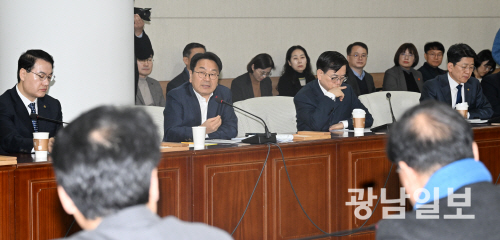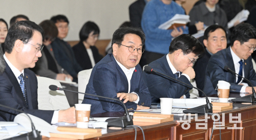 | 광주·전남 행정통합 추진상황 설명 하는 강기정 시장 6일 오전 광주시의회 대회의실에서 열린 광주·전남 행정통합 시의원 간담회에서 강기정 광주시장이 추진상황에 대해 설명을 하고 있다. 최기남 기자 bluesky@gwangnam.co.kr |