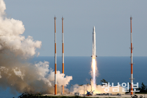 | 고흥군 외나로도 나로우주센터 발사대에서 불기둥을 내뿜으며 발사되고 있는 한국 최초의 우주발사체 나로호(KSLV-1). |
