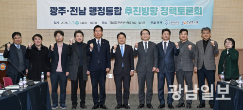 | 광주·전남 행정통합 정책토론회 7일 오후 광주 서구 치평동 김대중컨벤션센터에서 열린 광주·전남 행정통합 추진방향 정책토론회에 참석한 강기정 광주시장과 내빈및 토론자들이 기념 촬영을 하고 있다.최기남 기자 bluesky@gwangnam.co.kr |