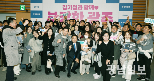 | ‘광주, 처음보다 더 극적인 두 번째 등장’ 출판기념회 강기정 광주시장이11일 오후 광주 서구 치평동 김대중컨벤션센터에서 열린 ‘광주, 처음보다 더 극적인 두 번째 등장’ 출판기념회에서 시민들과 기념촬영을 하고 있다.최기남 기자 bluesky@gwangnam.co.kr |