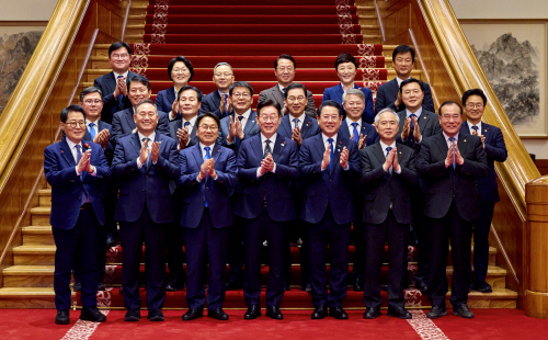 | 이재명 대통령은 지난 9일 청와대에서 광주·전남 지역구 더불어민주당 국회의원들과 강기정 광주시장, 김영록 전남도지사 등과 광주·전남 행정통합 추진 방안을 논의한 후 기념사진을 촬영하고 있다. |