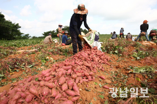 | 해남군 대표 농특산물인 해남고구마가 중·소농 공동출하 체계를 통해 국내 최대 도매시장인 서울 가락시장에 진출했다. 해남 농민들이 재배한 해남고구마를 수확하는 모습. |