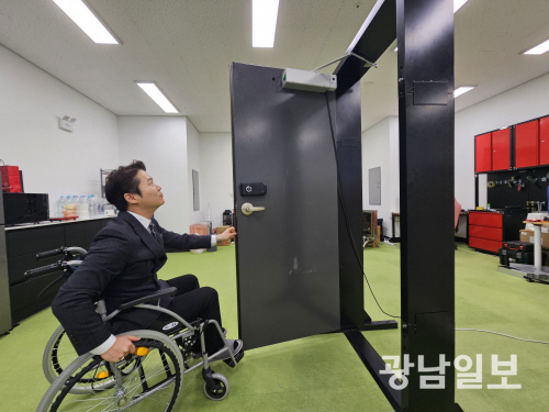 | 변철원 뮤네릭스 대표가 제품 설명을 위해 휠체어 앉아 AI 기반 여닫이문 출입 자동화 시스템에 대해 설명하고 있다. |