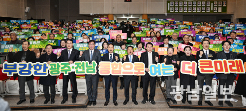 | 광주·전남 행정통합을 위한 시·도민공청회 19일 오후 광주 동구청 대회의실에서 열린 광주·전남 행정통합 권역별 합동 공청회에 참석한 강기정 광주시장과 정준호 국회의원,이정선 광주시교육감,임택 광주 동구청장등 참석자들이 기념 촬영을 하고 있다.최기남 기자 bluesky@gwangnam.co.kr |