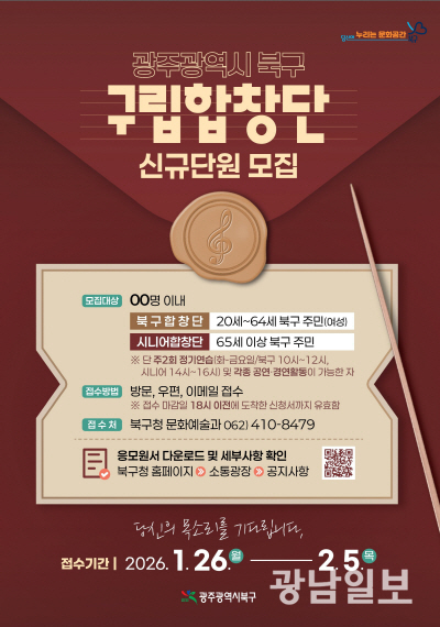 합창단으로 활동하고 싶은 주민은 북구청 누리집 공지사항을 참고해 기간 내 서류를 제출하면 되고 기타 자세한 사항은 북구청 문화예술과(062-410-8479)로 문의하면 된다.