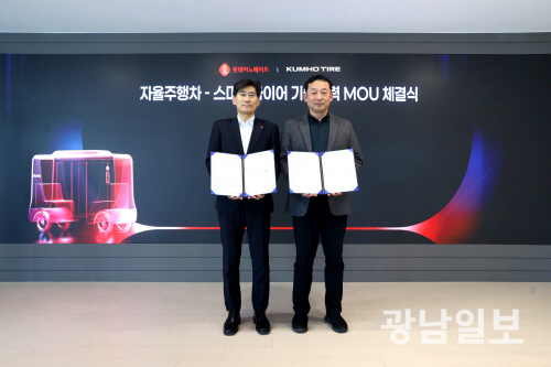 | 금호타이어와 롯데이노베이트가 지난 20일 서울 롯데이노베이트 본사에서 자율주행차와 스마트 타이어 기술의 실증 추진을 위한 상호 기술 개선 업무협약을 체결했다. 사진 왼쪽부터 롯데이노베이트 모빌리티부문 윤태은 상무, 금호타이어 상품개발 3부문 송강종 상무. |