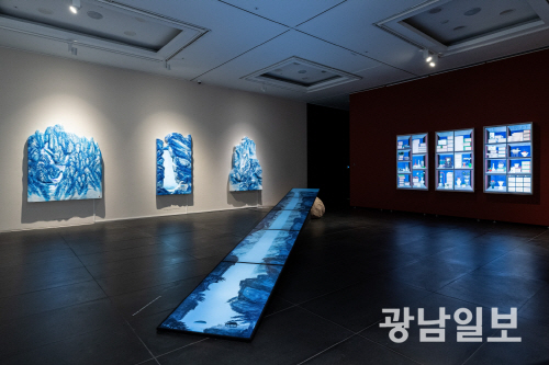 전시의 주요 모티프는 관람자가 시선을 이동하며 풍경을 감상하는 와유(臥遊)를 통해 완성되는 회화 장르로 단일한 시점이 아닌, 다층적인 시선을 전제로 한 전통 산수화다. 이 작가는 이런 산수화의 특성을 바탕으로 전통 매체와 최신 기술을 넘나드는 작품들을 선보이며, 풍경을 바라보는 다양한 시선을 현대적으로 재구성한다. 고전과 현대, 평면과 입체, 회화와 영상이 한 공간에서 중첩되는 ‘산수극장’이 작가의 손끝에서 탄생했다.