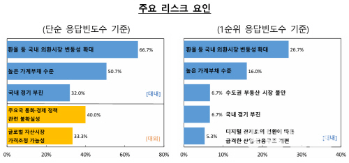 위험 순위를 고려하지 않고 단순히 응답(5가지 요인 복수 응답) 빈도수만 따지면, 대내 요인으로는 환율 등 국내 외환시장 변동성 확대(66.7%), 높은 가계부채 수준(50.7%), 국내 경기 부진(32.0%) 등이 많이 거론됐다.