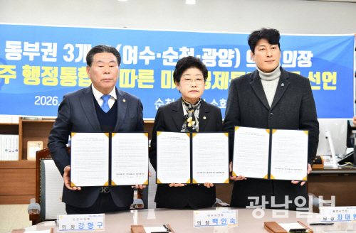 28일 여수시의회에 따르면 백인숙 여수시의회 의장과 강형구 순천시의회 의장, 최대원 광양시의회 의장은 전날 순천시의회 의장실에서 ‘전남·광주 행정통합에 따른 전남동부권(여수·순천·광양) 미래경제동맹 공동선언문’ 을 발표했다.