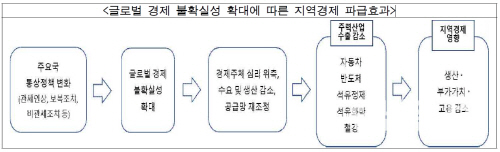 이어 “대외 충격에 대한 민감도를 낮추기 위해 지역 주력산업의 중장기 경쟁력 강화와 수출 리스크 분산 정책이 필요하다”며 “수출시장 다변화나 산업경쟁력 강화, 제품의 고부가가치화 등 경쟁력 재편을 고려한 단계적 접근이 요구된다”고 덧붙였다.