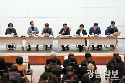 | 강기정 광주시장이 30일 광주교통공사 대회의실에서 열린 ‘광주전남 행정통합 건설·안전·교통·노동 분야 시민공청회’에 참석해 행정통합 추진사항을 설명한 후 참석자들의 의견을 수렴하고 있다. 사진제공=광주시 |