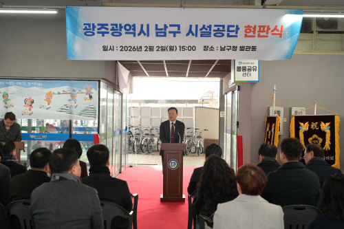 | 광주 남구는 2일 청사 별관에서 김병내 남구청장을 비롯한 관계자들이 참석한 가운데 광주 남구시설공단 현판식을 갖고, 공단의 성공적인 출범을 대외적으로 공식화했다. 사진은 김병내 남구청장이 인사말을 하고 있는 모습. |