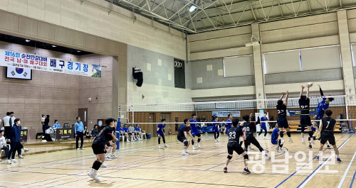 | 지난해 5월 순천에서 열린 제16회 순천만갈대배 전국 남여 배구대회에서 선수들이 기량을 펼치고 있다. |
