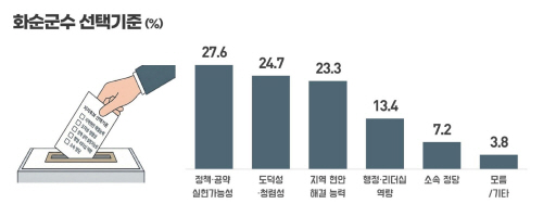 그 다음으로는 도덕성·청렴성이 24.7%, 지역 현안 해결 능력이 23.3%로 나타나, 군정 운영의 실무 역량과 함께 개인의 신뢰성을 중시하는 인식이 강하게 반영됐다. 반면 행정·리더십 역량은 13.4%로 상대적으로 낮았고, 소속 정당을 기준으로 꼽은 응답은 7.2%에 그쳤다. 모름·기타는 3.8%였다.