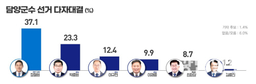 5일 광남일보와 KBC 광주방송이 여론조사 전문기관 리서치뷰에 의뢰해 지난 2~3일 이틀간 만 18세 이상 담양군민 500명을 대상으로 실시한 여론조사 결과, 담양군수 다자대결 지지도에서 정철원 담양군수가 37.1%로 가장 높은 지지를 얻었다.