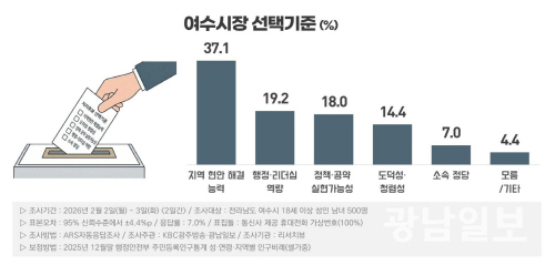 5일 광남일보와 KBC광주방송이 여론조사 전문기관 리서치뷰에 의뢰해 지난 2~3일 이틀간 여수시에 거주하는 만 18세 이상 성인남녀 500명을 대상으로 여론조사를 실시한 결과, ‘여수시장 후보를 선택할 때 가장 중점을 두는 기준’을 묻는 질문에 지역 현안 해결 능력이 37.1%로 가장 높은 응답률을 기록했다.