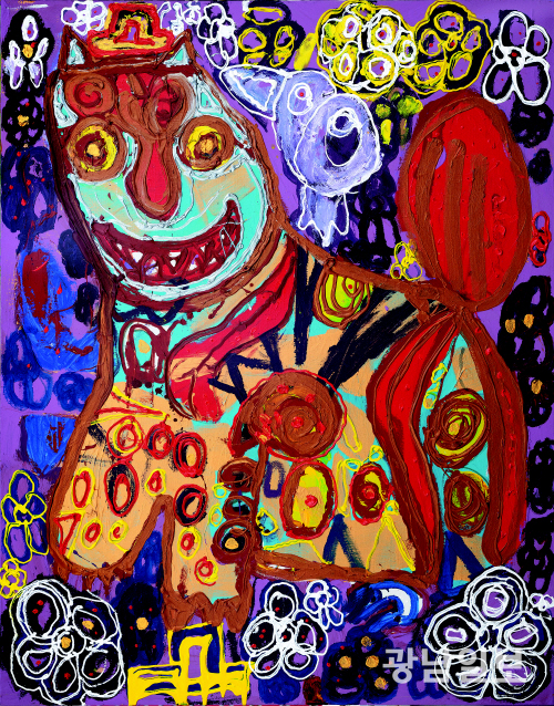 작가의 작업은 인물과 꽃, 동물, 사물 등 일상에서 마주한 대상들을 특정한 서사나 상징으로 환원하지 않고, 화면 안에 동등한 감각 단위로 배치하는 방식으로 전개된다. 이는 언어적 개념보다 이미지와 감각이 우선하는 그의 인식 구조와 맞닿아 있다. 작가에게 회화는 설명을 위한 재현이 아니라, 자신만의 방식으로 세계에 말을 거는 시각 언어로 풀이된다.