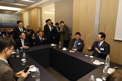 | 김성환 기후환경에너지부장관(오른쪽 두번째)와 김영록 전남도지사(오른쪽 첫번째), 김대인 신안군수 권한대행(오른쪽 세번째)가 신안라마다호텔에서 사업관계자와 해상풍력 관련 간담회를 하고 있다. |