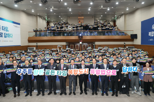 | 공영민 고흥군수와 박동식 사천시장 등 관계자들이 최근 사천시청 대강당에서 열린 미지답 사천포럼에서 ‘우주항공복합도시 특별법’의 조속한 제정을 촉구하며 손피켓 퍼포먼스를 펼치고 있다. |