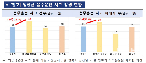 음주운전 사고는 본격 귀성 직전인 설 연휴 전전날 하루 평균 72건으로 집계됐다. 평상시보다 24.1% 높은 수치다.