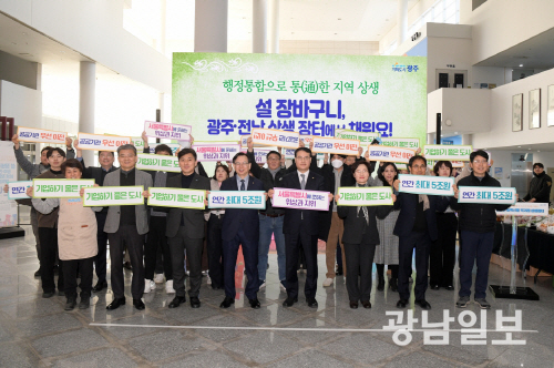| 광주시는 설 명절을 앞두고 9일 시청 1층 시민홀에서 ‘광주·전남 행정통합을 위한 설맞이 농특산물 직거래장터’를 열었다. |